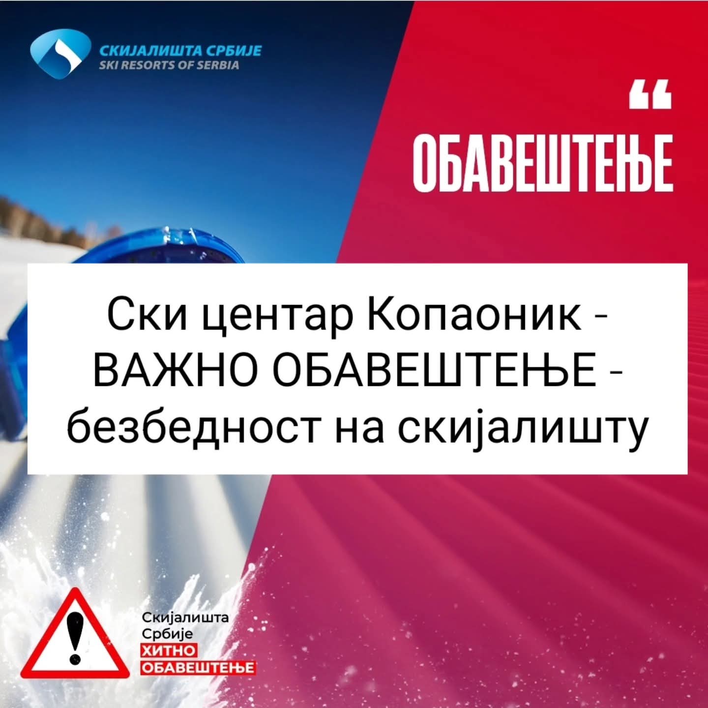 JP Skijališta Srbije obaveštavaju sve posetioce ski centra Kopaonik da je bezbednost skijaša i bordera apsolutni prioritet, te da se rad ski instalacija odvija isključivo u skladu sa važećim bezbednosnim standardima i vremenskim uslovima.
